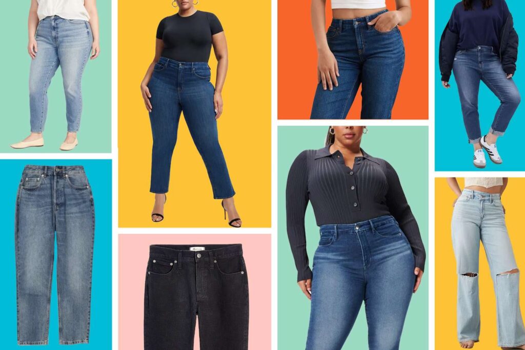 Typisk er højtaljede eller mellemhøje jeans mest flatterende, da de giver god dækning, støtte og fremhæver taljen.