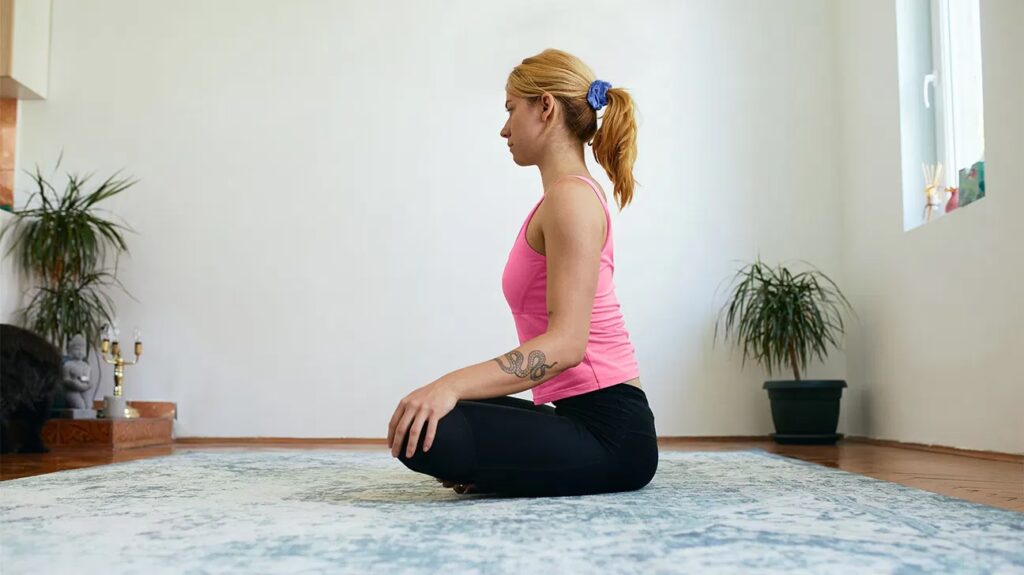 Dette er den mest tilgængelige siddende stilling for de fleste. Man sidder med krydsede ben, hvor fødderne er placeret under de modsatte knæ. Målet er at finde en position, hvor hofterne er højere end knæene for at opretholde en naturlig kurve i lænden og lette en oprejst rygsøjle. Hvis hofterne er stramme, kan man sidde på en pude eller blok for at løfte hofterne. Sukhasana er god for begyndere og tillader sindet at falde til ro, da kroppen ikke kæmper for stabilitet.