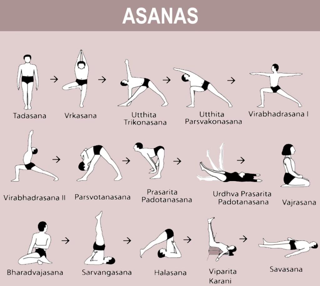 - Asana: Fysiske stillinger. Oprindeligt blot siddende stillinger til meditation, men udviklede sig til de mange stillinger, vi kender i dag, for at rense energikanaler og skabe fysisk og mental stabilitet.