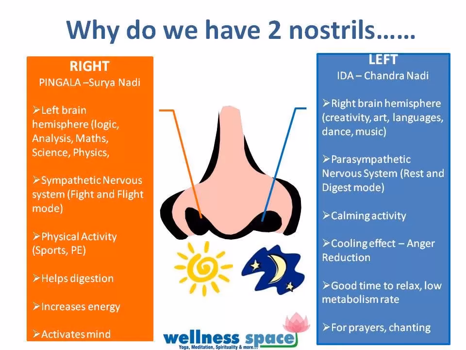 Mange kender ikke til det, men der er en naturlig rytme i vores åndedræt gennem næseborene. Hvert af vores næsebor er forbundet til forskellige sider af hjernen. Det højre næsebor menes at være forbundet til venstre hjernehalvdel, som ofte associeres med logik, analyse og den 'mekaniske' side af vores tænkning. Det venstre næsebor menes at være forbundet til højre hjernehalvdel, som associeres med kreativitet, intuition, afslapning og den 'helende' side.