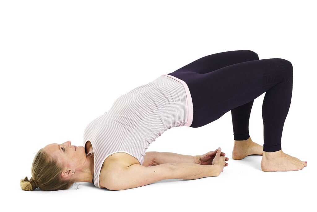 • Hofteekstension: Evnen til at strække hoften helt ud, så kroppen danner en lige linje fra knæ til skulder i en mindre udfordrende bro-variation, og til at skubbe hoften højt op i den fulde bro.