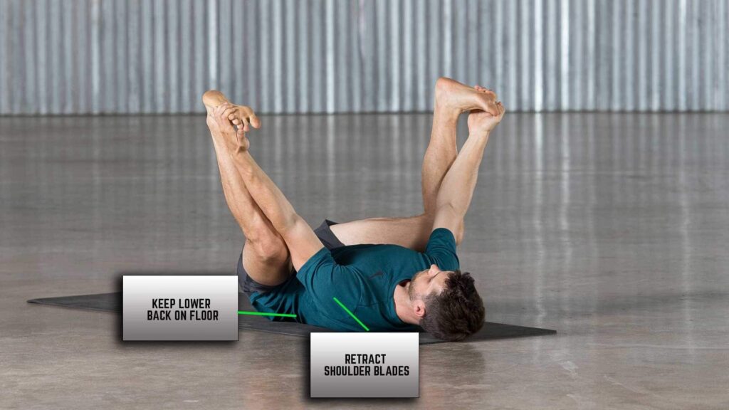 - Trin 5: Fleks fødderne. Fleks dine fødder, som om du presser fodsålerne mod loftet. Dette skaber en aktiv strækning. Hold dine skuldre og nakke afslappede mod måtten. Undgå at løfte hovedet eller skuldrene fra gulvet.