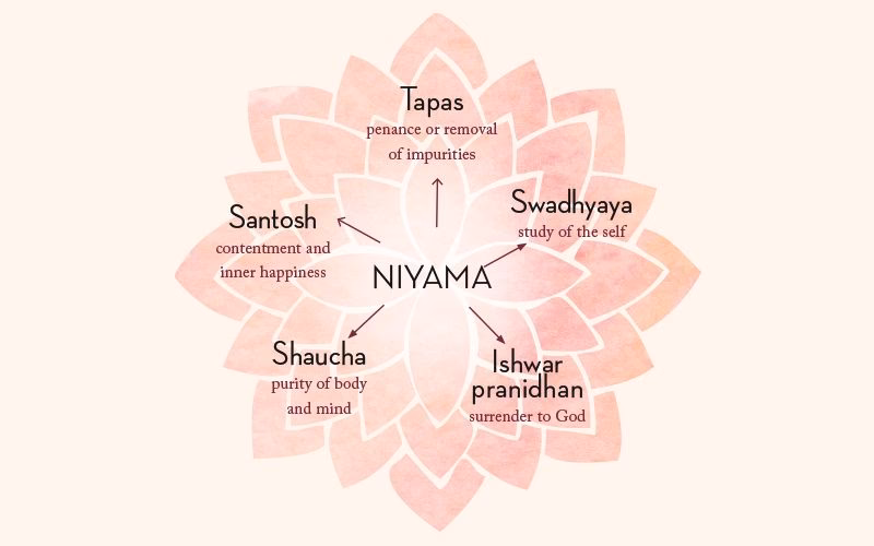 Niyama består også af fem principper, men de fokuserer indad. De er discipliner for personlig vækst, selvpleje og spirituel udvikling.