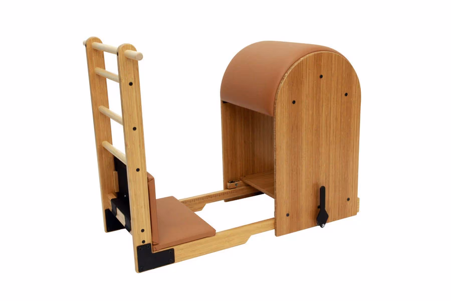 Ladder Barrel er et unikt stykke Pilates-udstyr, der består af en træstige med trin forbundet til et polstret, afrundet barrel. Afstanden mellem stigen og barrelet kan justeres for at imødekomme brugerens højde, hvilket sikrer optimal positionering og støtte under øvelserne. Udstyret er designet til at udfordre core-stabilitet, styrke rygsøjlen og forbedre den generelle fleksibilitet. Det er et alsidigt redskab, der kan bruges af både begyndere og øvede Pilates-udøvere.