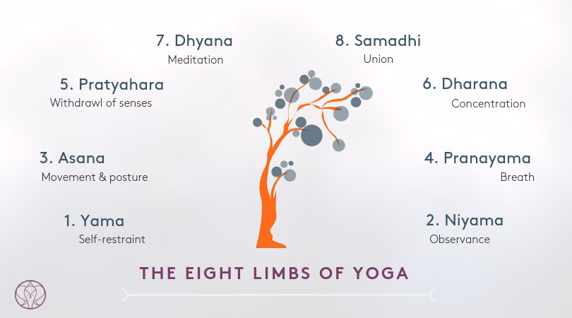 4. Pranayama (Åndedrætskontrol): Teknikker til at regulere åndedrættet. Prana betyder livsenergi, og Yama betyder kontrol. Ved at kontrollere åndedrættet kan vi påvirke og berolige sindet.