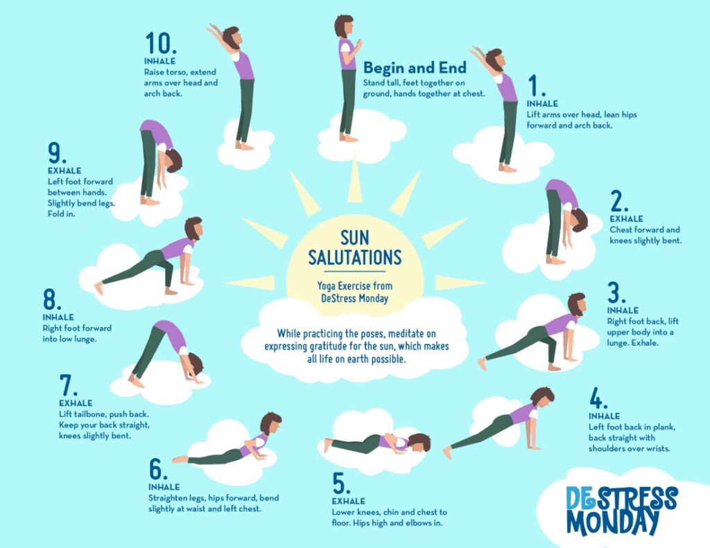 - Solhilsner (Surya Namaskar): En sekvens af stillinger, der udføres i flow. De er dynamiske og varmer kroppen op, hvilket øger kalorieforbrændingen, især når de udføres gentagne gange.