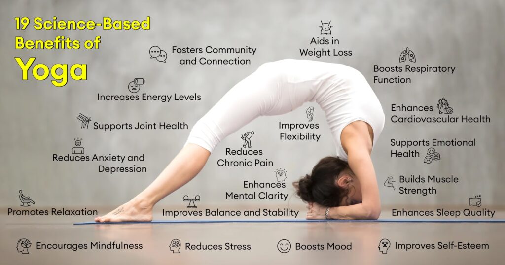 Baseret på eksisterende forskning tyder beviser på, at yoga kan være gavnligt for at håndtere tilstande som hypertension (forhøjet blodtryk), stressrelateret depression, angst, symptomer på PTSD, fibromyalgi-smerter og bronkial astma (især gennem åndedrætsøvelser). Det kan også bidrage til at forbedre rygsøjlens sundhed og forebygge aldersrelateret kardiovaskulær forringelse.