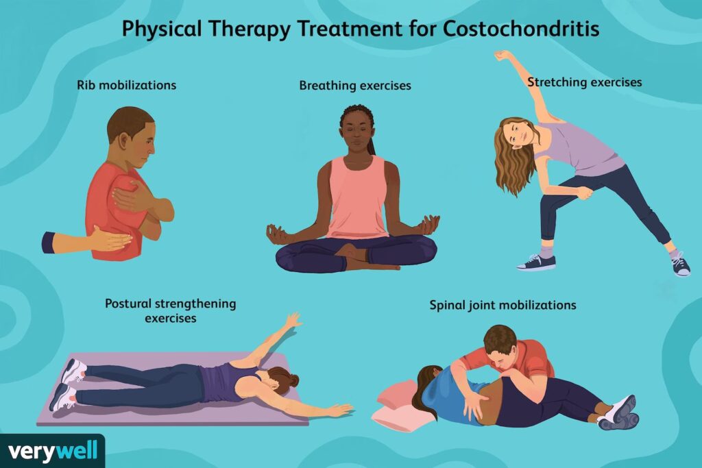Disse strækøvelser kan hjælpe med at forbedre fleksibiliteten og reducere muskelspændinger omkring brystet. Fysioterapi kan også give specifikke øvelser, der er skræddersyet til din situation. Målet er at holde sig i gang (undgå lange perioder med hvile), men inden for smertegrænsen. Det er vigtigt at lytte til din krop og øge aktiviteten gradvist.