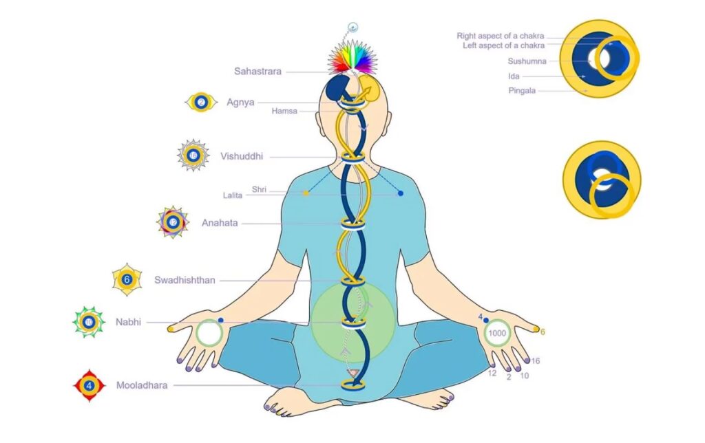 Ida og Pingala snor sig op langs rygsøjlen som to slanger, der krydser hinanden ved kroppens energicentre, kendt som chakraer. De mødes ved bunden af rygsøjlen, krydser hinanden ved mave, hjerte, hals og pande, og ender i hvert sit næsebor. Den centrale energikanal, der løber lige op langs rygsøjlen, kaldes Sushumna Nadi. Når Ida og Pingala er i balance, siges energien at kunne strømme frit op gennem Sushumna, hvilket fører til en følelse af helhed, klarhed og en dybere forbindelse til vores sande selv. Denne tilstand af balance er målet i mange yogapraksisser. Ubalance mellem Ida og Pingala er meget almindeligt i vores moderne liv. Vi lever ofte i en tilstand af konstant stress (Pingala overaktiv) eller sløvhed (Ida overaktiv eller blokeret). Denne ubalance kan have en dybtgående effekt på vores fysiske og mentale sundhed, herunder vores evne til at træne effektivt, håndtere stress, sove godt og opretholde en positiv sindstilstand. At arbejde bevidst med at bringe Ida og Pingala i balance er derfor en kraftfuld praksis for at forbedre livskvaliteten markant.