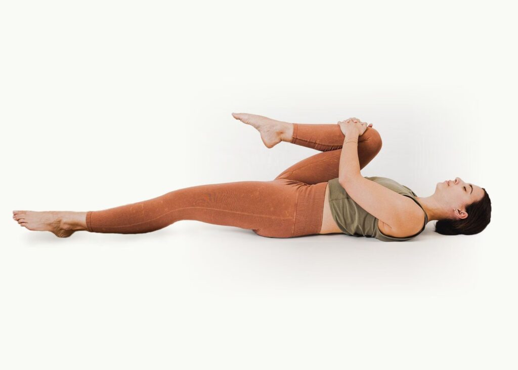 - Træk vejret ind, og når du puster ud, trækker du det ene knæ op mod brystet. Brug dine hænder til blidt at trække knæet tættere på.